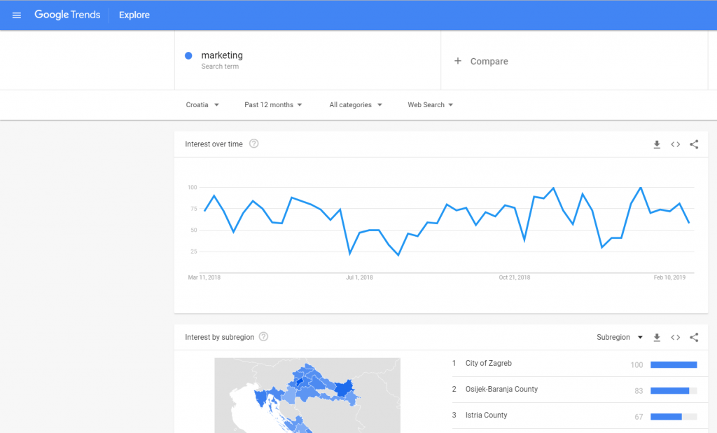 No, što vam vrijedi izvrstan proizvod ako nikome ne treba, ako za njega interes ne postoji. Zato je potrebno napraviti istraživanje. Možete započeti s Google Trends – jednostavno upišite temu ili ključnu riječ koja ima veze s digitalnim proizvodom. Trends će vam pokazati koliko je ključna riječ popularna u određenom vremenskom razdoblju. Dodatna je prednost što možete odabrati i zemlju koju želite istražiti. Čak vidite i koliko je tema popularna u kojoj županiji ili regiji.