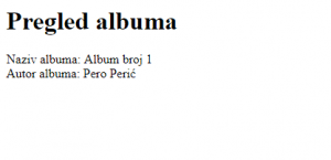 <h1>Pregled albuma</h1> <div>Naziv albuma: {{ $naziv }} </div> <div>Autor albuma: {{ $autor}} </div>