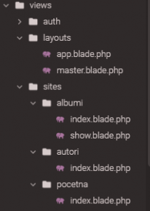 - Unutar resource – > views foldera trenutno imamo 4 fajla: welcome.blade.php koji prikazuje početnu stranicu, albumi.blade.php koji će prikazivati sve albume, album.blade.php koji prikazuje odabrani album i autori.blade.php koji će prikazivati sve autore.
